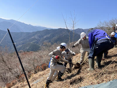 藤岡市が主催する桜山公園での植樹試験で、植樹の作業を行いました。2,3)