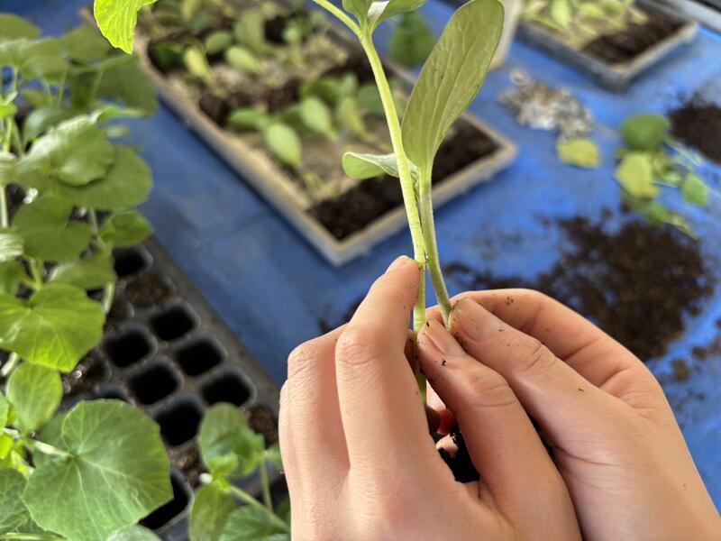 病気に耐性のある苗を作るために、キュウリの接木苗を作る実習を行いました。ちゃんとつながってくれるかな・・・
